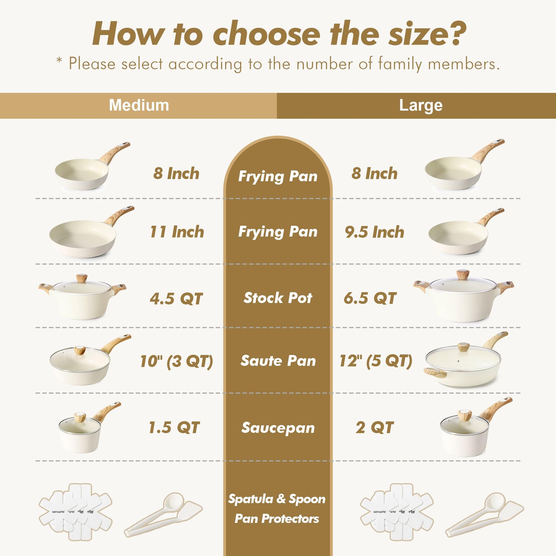 - 14 Piece Pots and Pans Set Includes - 8 & 9.5 inch frying pan set, 12inch/5Qt saute pan with lid, 6.5Qt casserole with lid, 2Qt saucepan with lid, 2pcs multi-purpose utensils, 4pcs pot protectors.